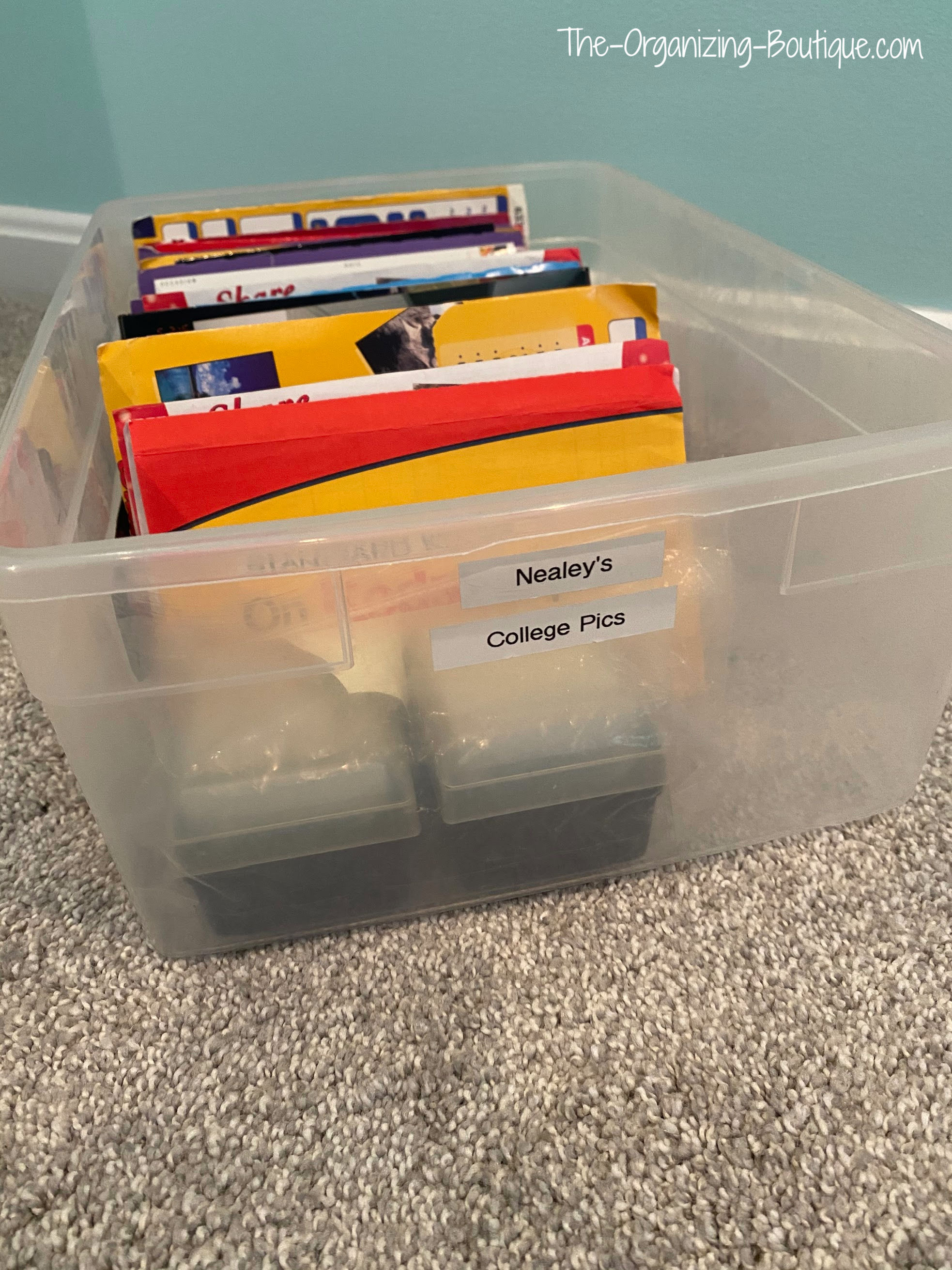 appropriate category. As pictured above, I use The Container Store's acid-free clear boxes to organize my photos by time period.