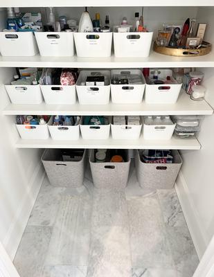 Most bathrooms end up cluttered because of duplicates. Extra toothpaste, shampoo, skincare, etc. Instead of letting those mix in with everyday items, create a separate backstock area.